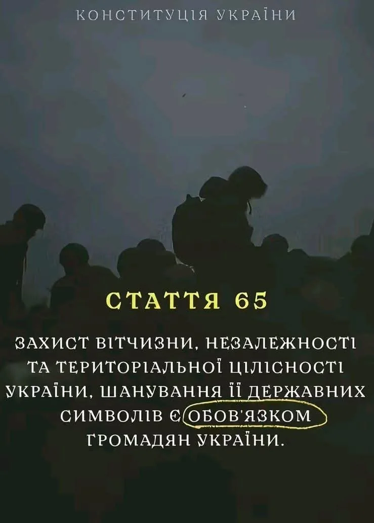 Ви знаєте, що існує стаття Стаття 65 Конституції України визначає, що захист Вітчизни, її незалежності та територіальної цілісності, а також шанування державних символів є конституційним обов'язком громадян України. Згідно з цією статтею, громадяни відбувають військову службу відповідно до закону.
