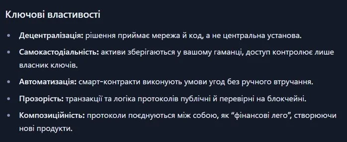 ✍️ DeFi (Decentralized Finance) — це сукупність фінансових сервісів на блокчейні, що працюють через смарт-контракти й децентралізовані додатки без банків та посередників. Користувачі самі керують активами у своїх гаманцях, а правила операцій закладені в код протоколів. DeFi забезпечує глобальний, відкритий і прозорий доступ до кредитів, обмінів, дохідності та управління.
