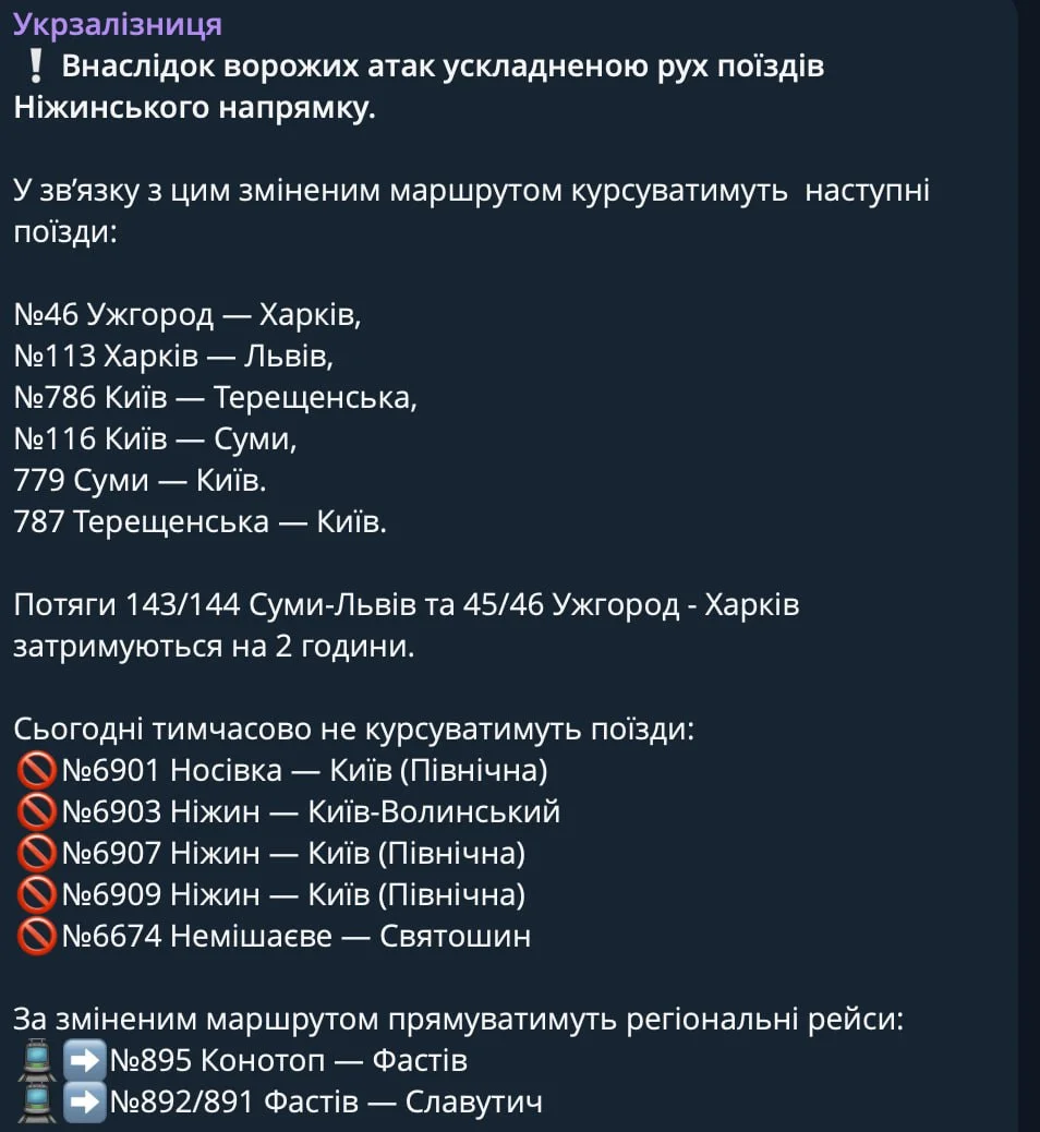 Внаслідок ворожих атак ускладненою рух поїздів Ніжинського напрямку, — У/З.