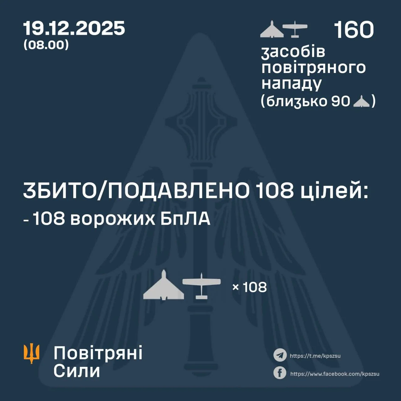 https://t.me/Ukraineaboveallelse✈️ 19.12.2025 силами оборони було знищено/подавлено: 🛵 108/160 ударних БПЛА “Шахед“/“Гербера“/“Пародія“ та інші. ❗️ Зафіксовано влучання 47 ударних БпЛА на 23 локаціях . ☝️ Атака триває, в повітряному просторі декілька ворожих БпЛА. https://t.me/Ukraineaboveallelse61переглядів -
