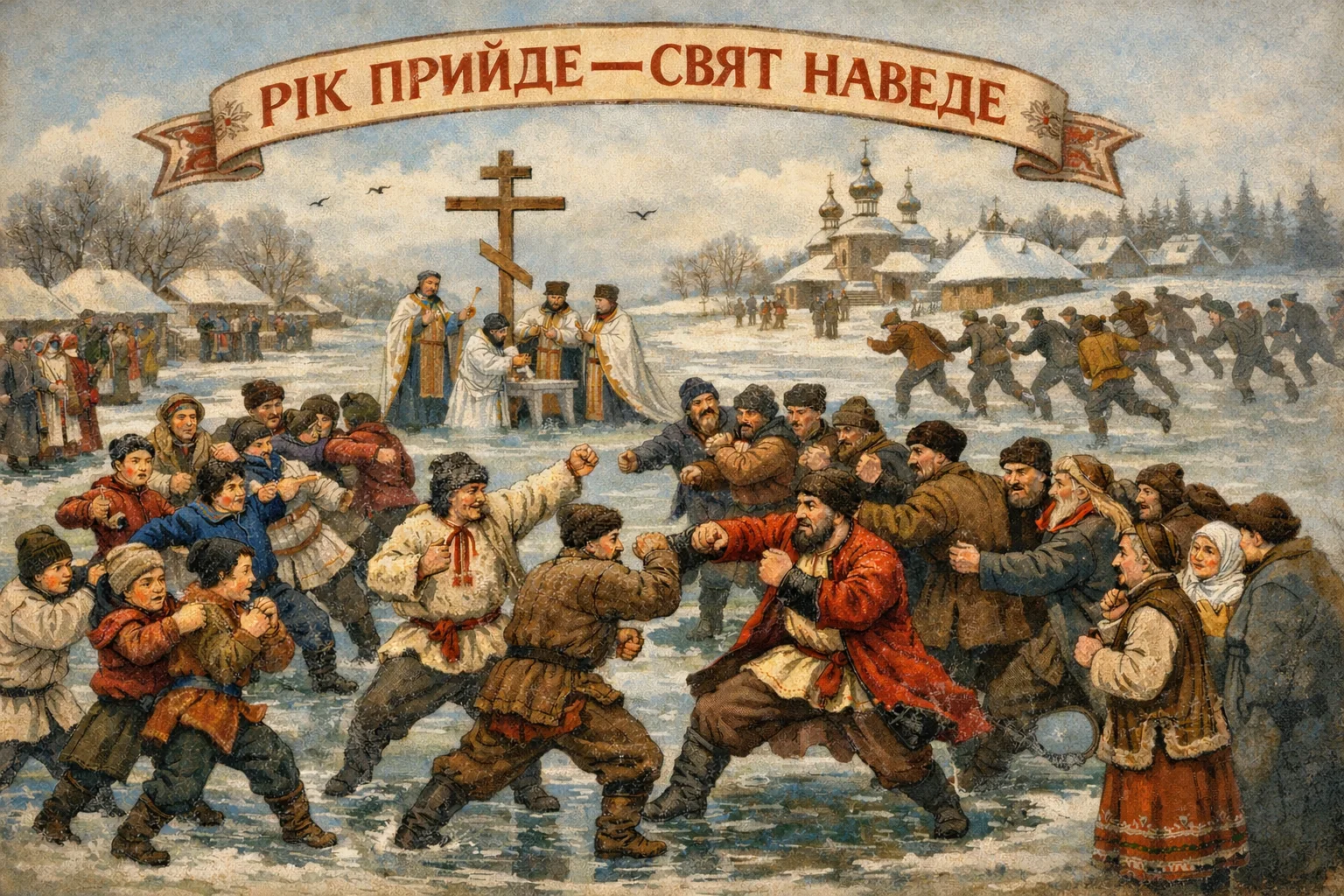 Кулачні бої - народна ритуалізована розвага, відома ще з дохристиянських часів. Вони зазвичай проходили взимку на льоду річок, ставків, озер, нерідко там, де відбувався обряд водосвяття. Сходилися чоловіки з двох сусідніх сіл або хуторів; у великих селах, як і в містах, бої йшли між представниками вулиць або кутків. Кулачні бійці дотримувалися певних правил. Спочатку «чубарилися» діти, після них показували свою відвагу й спритність парубки, і лише потім уключалися в боротьбу дорослі чоловіки. Неписаний закон не дозволяв бити лежачого або бити з-за спини; ті, що виходили з гри, сідали на лід або відбігали вбік. Переможцем вважалася та сторона, якій удавалося витіснити суперників із поля бою (престижно було відвоювати місце біля йорданського хреста) або змусити їх утекти. Іноді відступаючих переслідували аж до їхнього села й там знімали з церкви дзвін, що вважалося великою образою для громади, якій доводилося сплачувати викуп. Кращі кулачні бійці користувалися в народі великою повагою.