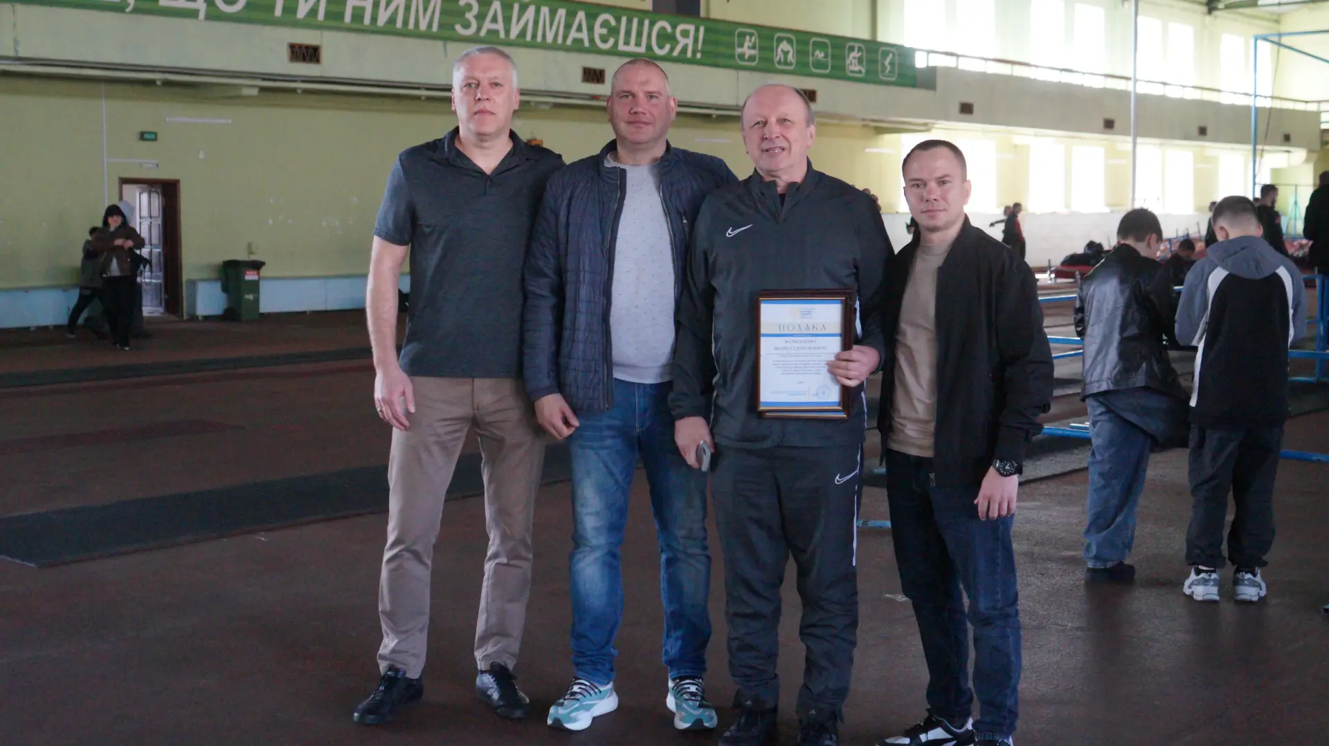 Заступник начальника управління молоді та спорту КОВА Володимир Стеценко, начальник відділу фізичної культури та спорту БМР Дмитро Рожков, директор ДЮСШ управління освіти і науки БМР Сергій Кульчицький та директор Центру адаптивного та масового спорту Київщини Олександр Васюк на відкритті чемпіонату України з французького боксу "Сават"