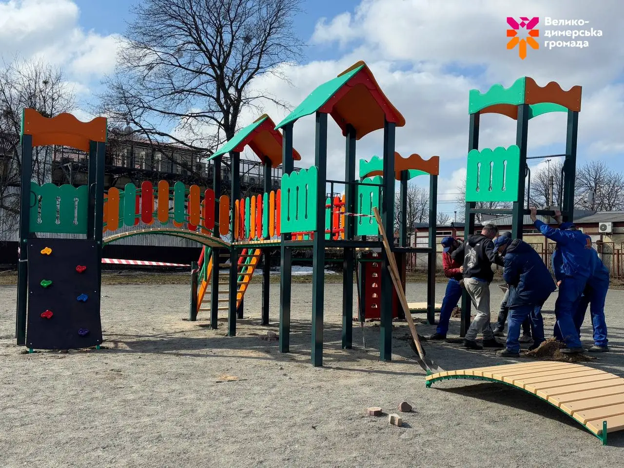 Наразі триває монтаж ігрового обладнання: встановлюють гірку-вежу, гойдалки, пісочницю та ігрові елементи на пружинах.