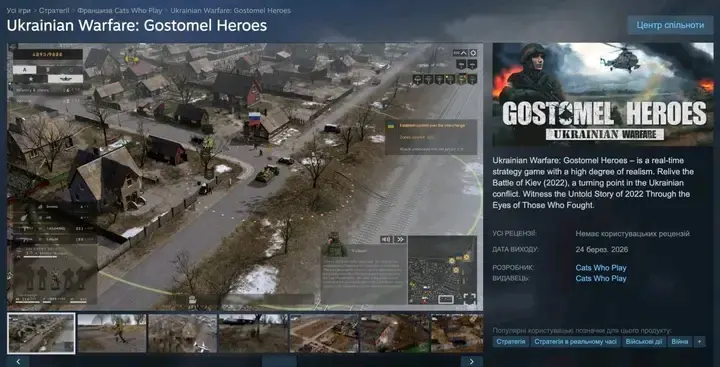 Російська студія Cats Who Play готує реліз гри у Steam про бої за аеродром "Антонов" у Гостомелі на початку повномасштабного вторгнення Росії у 2022 році.