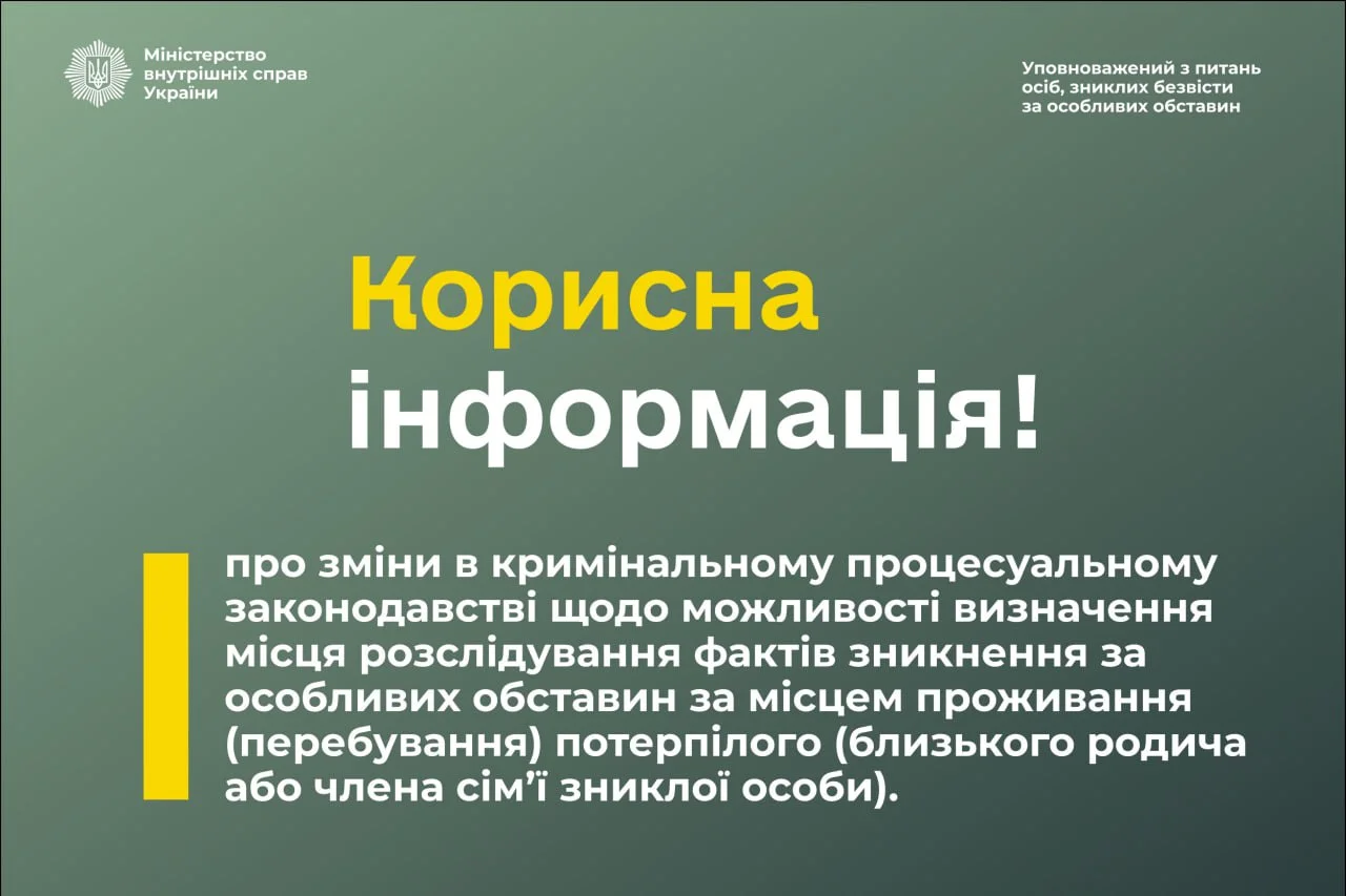 Нагадуємо, що у липні 2025 року до Кримінального процесуального кодексу України були внесені зміни, які визначають особливості досудового розслідування кримінальних правопорушень, пов’язаних зі зникненням осіб безвісти за особливих обставин під час дії воєнного стану.