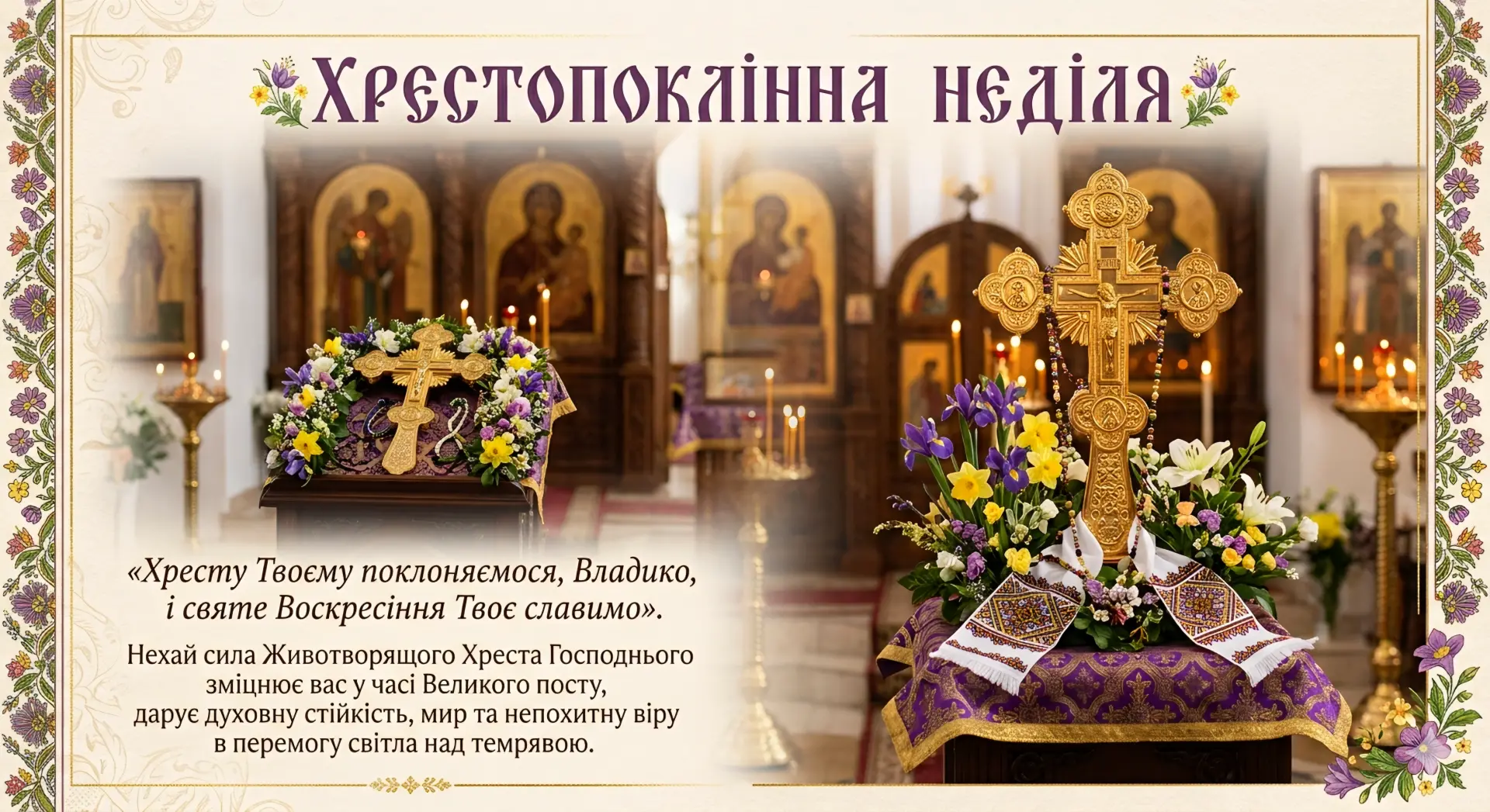 Третя неділя Великого посту знаменує середину Святої Чотиридесятниці та зветься Хрестопоклонною. У цей день Церква виносить для поклоніння Животворящий Хрест Господній, нагадуючи вірянам про силу Христової жертви та надію на Воскресіння.