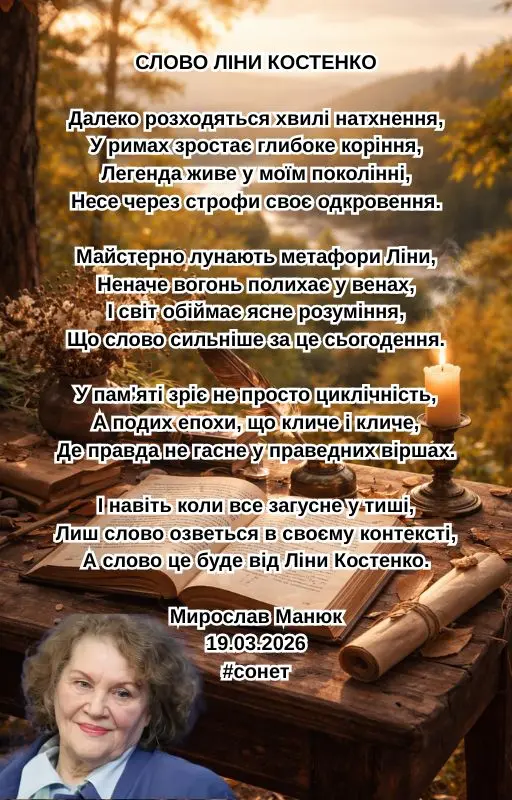 СЛОВО ЛІНИ КОСТЕНКО Далеко розходяться хвилі натхнення, У римах зростає глибоке коріння, Легенда живе у моїм поколінні, Несе через строфи своє одкровення. Майстерно лунають метафори Ліни, Неначе вогонь полихає у венах, І світ обіймає ясне розуміння, Що слово сильніше за це сьогодення. У пам'яті зріє не просто циклічність, А подих епохи, що кличе і кличе, Де правда не гасне у праведних віршах. І навіть коли все загусне у тиші, Лиш слово озветься в своєму контексті, А слово це буде від Ліни Костенко. Мирослав Манюк 19.03.2026 #ЛінаЩасливіЖитиПоруч #сонет