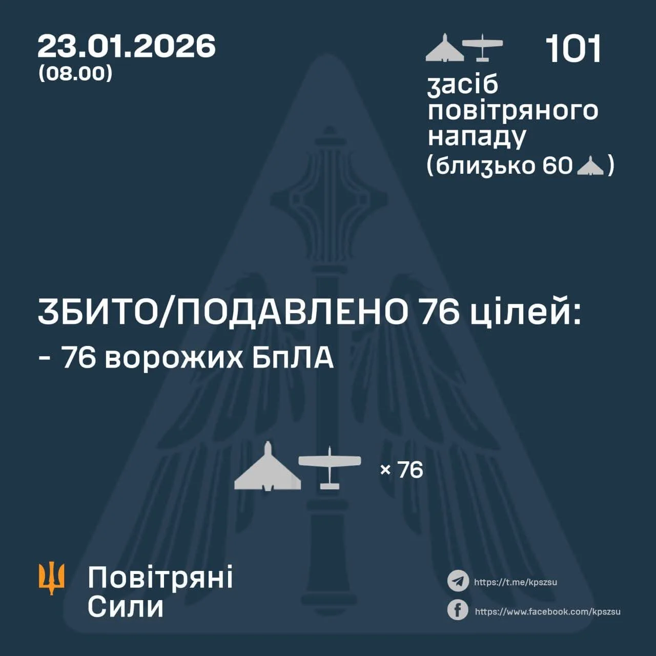 ⚡️ ЗБИТО/ПОДАВЛЕНО 76 ВОРОЖИХ БПЛА: У ніч на 23 січня (з 20:00 22 січня) противник атакував 101 ударним БпЛА типу Shahed (в т.ч. реактивними), Гербера і безпілотниками інших типів із напрямків: Курськ, Орел, Шаталово, Міллєрово, Приморсько-Ахтарськ – рф., Донецьк - ТОТ України, близько 60 із них – "шахеди". Повітряний напад відбивали авіація, зенітні ракетні війська, підрозділи РЕБ та безпілотних систем, мобільні вогневі групи Сил оборони України. 💥 За попередніми даними, станом на 08:00, протиповітряною обороною збито/подавлено 76 ворожих БпЛА типу Shahed, Гербера і дронів інших типів. Зафіксовано влучання 19 ударних БпЛА на 12 локаціях. Атака триває, в повітряному просторі декілька ворожих БпЛА. Дотримуйтесь правил безпеки! https://t.me/Ukraineaboveallelse