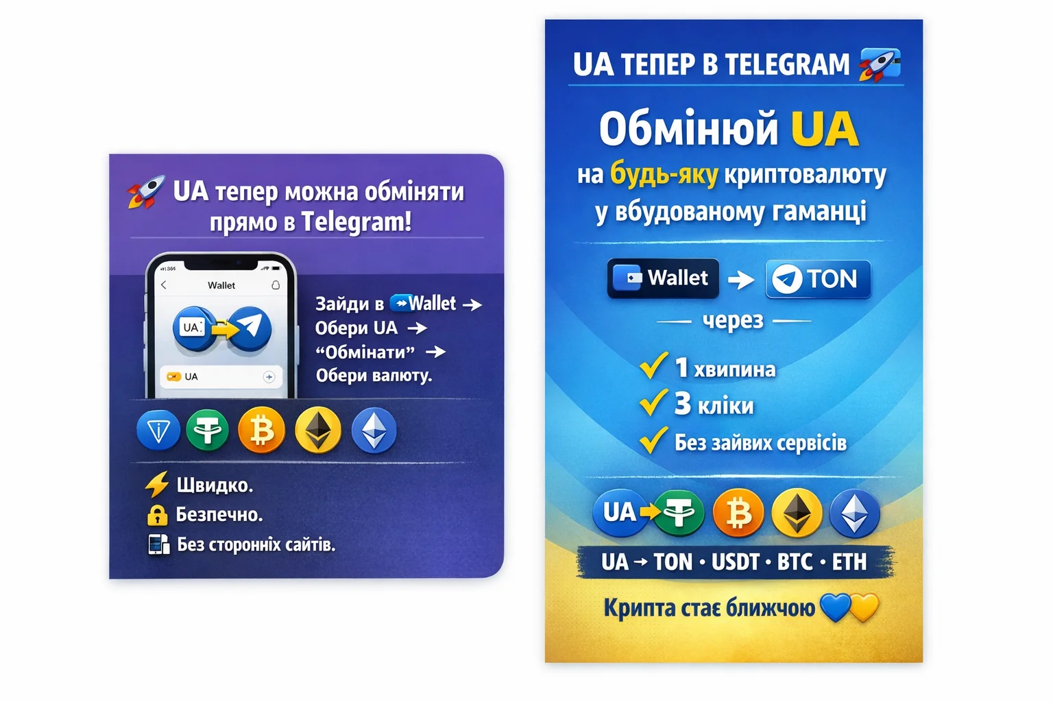 Вбудований гаманець Telegram дозволяє обміняти токен UA на будь-яку популярну криптовалюту за кілька кліків.