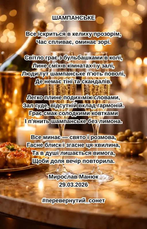 ШАМПАНСЬКЕ Все іскриться в келиху прозорім, Час спливає, оминає зорі. Світло грає з бульбашками в колі, Лине сміх в кімнатах і у залі, Люди тут шампанське п'ють поволі, Де немає тіні та скандалів. Легко плине подих між словами, Зал гуде, відсутній вклад гармоній. Грає смак солодкими ковтками І п'янить шампанське без лимона. Все минає — свято і розмова, Гасне блиск і згасне ця хвилина, Та в душі лишається вимога, Щоби доля вечір повторила. Мирослав Манюк 29.03.2026 #перевернутий_сонет
