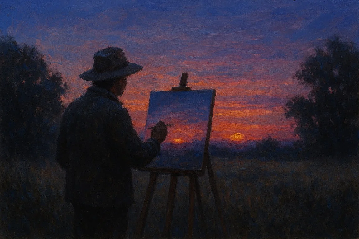 “Досить на сьогодні.” Складаю речі, закидаю етюдник на плече й повільно йду стежкою додому. В кишені брязкають ключі, а в голові вже крутиться думка: завтра, може, намалюю світанок. Але то — завтра. А сьогодні… сьогодні — час вечеряти і дозволити сутінкам завершити те, що я тільки почав.