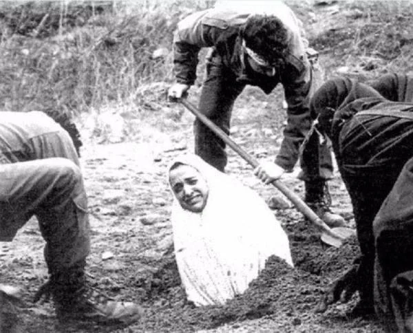 #архів Страта за зраду чоловікові в Ірані, 1954 рік. Страта проходила наступним чином: спочатку прикопування землею (до стану майже повного знерухомлення), потім жорстоке забивання камінням до смерті, після настання якої проводилося вже повне закопування і затоптування могили ногами.