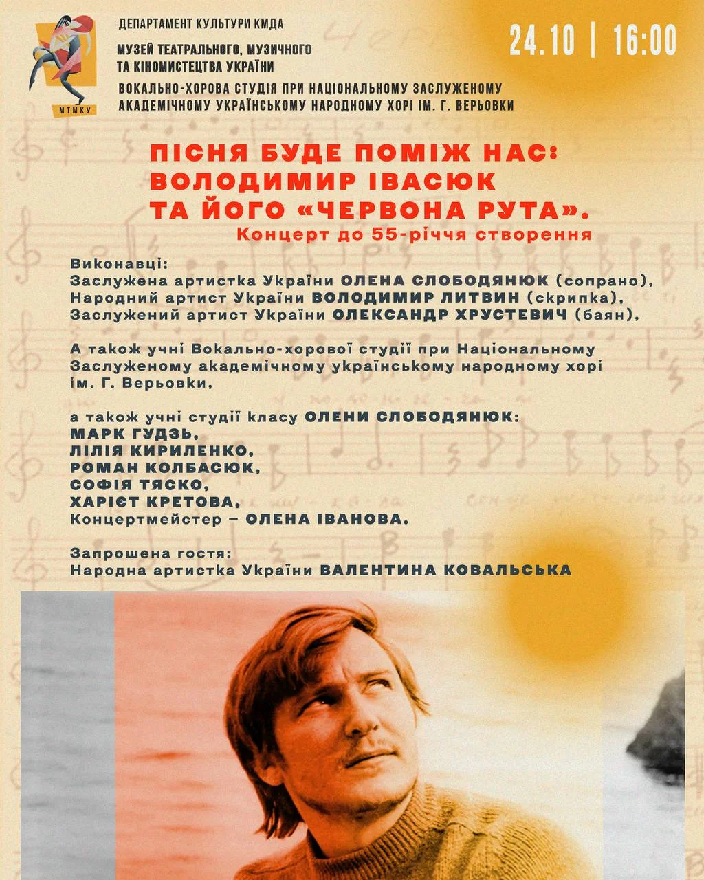 #заходи #музика #особистості Пісня буде поміж нас: Володимир Івасюк та його «Червона рута». До 55-річчя створення легендарної пісні «Червона рута» запрошуємо на музичний вечір, присвячений творчості Володимира Івасюка — митця, чия музика стала символом української душі 👇🏻 🗓️ 24 жовтня (п’ятниця) о 16:00 📍 Київ, музей театрального, музичного та кіномистецтва України У програмі — найвідоміші пісні композитора у виконанні: • Заслуженої артистки України Олени Слободянюк (сопрано) • Народного артиста України Володимира Литвина (скрипка) • Заслуженого артиста України Олександра Хрустевича (баян) • Студентів Вокально-хорової студії при Національному заслуженому академічному українському народному хорі ім. Г. Верьовки — Марка Гудзя, Лілії Кириленко, Романа Колбасюка, Софії Тяско та Харієт Кретової. 🎹 Концертмейстер — Олена Іванова. Запрошена гостя — Народна артистка України Валентина Ковальська. 💛Приходьте відчути тепло пісень, які єднають покоління. 🎫 Вхід за ціною музейного квитка. 📞 Довідки за телефонами: (044) 280 83 83, (044) 280 18 34.
