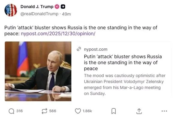🇺🇸 Трамп у себе в соцмережі поширив статтю з New York Post 📰, яка критикувала Путіна за те, що той зриває мирні переговори ☮️❌.