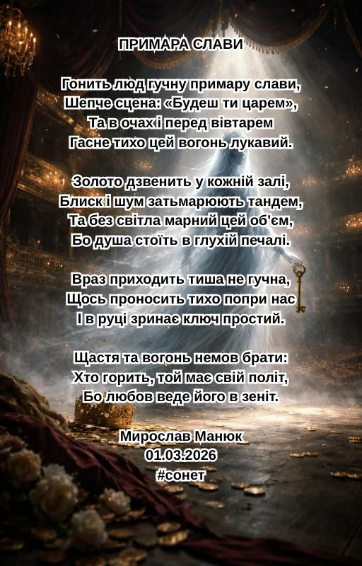 ПРИМАРА СЛАВИ Гонить люд гучну примару слави, Шепче сцена: «Будеш ти царем», Та в очах і перед вівтарем Гасне тихо цей вогонь лукавий. Золото дзвенить у кожній залі, Блиск і шум затьмарюють тандем, Та без світла марний цей об'єм, Бо душа стоїть в глухій печалі. Враз приходить тиша не гучна, Щось проносить тихо попри нас І в руці зринає ключ простий. Щастя та вогонь немов брати: Хто горить, той має свій політ, Бо любов веде його в зеніт. Мирослав Манюк 01.03.2026 #сонет