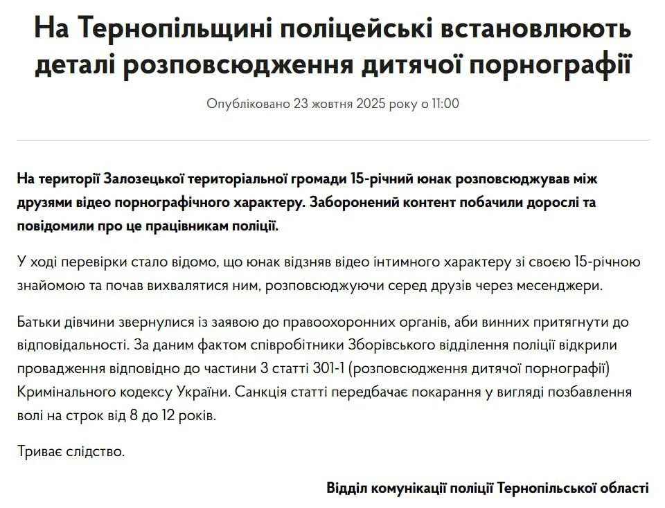 ℹ️15 жовтня поліція Тернопільщини затримала сімох військовослужбовців, яких підозрюють у викраденні, катуванні та вимаганні грошей: серед потерпілих були і цивільні, і військові, що перебували на реабілітації. Поліція не вказала, до якого підрозділу належать військові, але згодом у соцмережах Третьої окремої штурмової бригади з’явилось повідомлення про готовність співпрацювати зі слідством.
