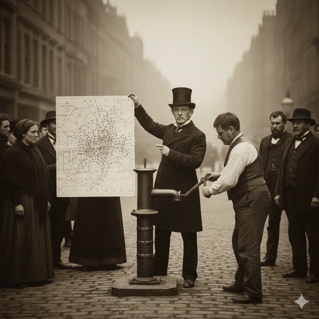 ​Джон Сноу не був зіркою медичних салонів. Скромний лікар, схильний до самотності та математичної точності, він почав власне розслідування, яке більше нагадувало детектив, ніж наукову працю. Сноу не вдихав повітря — він стукав у двері. Опитуючи мешканців, що вижили, він наносив на карту кожну смерть, точку за точкою, поки не помітив дивну закономірність: епіцентр смерті чітко фокусувався навколо громадської водопровідної колонки на Брод-стріт. 🗺️📍