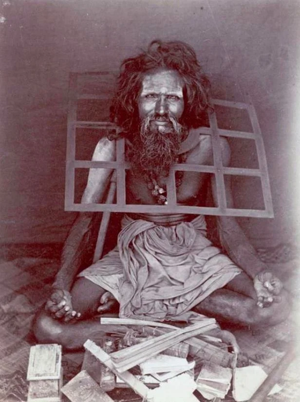 #архів Індійський аскет, що носить залізний нашийник на шиї, який не дозволяє йому лягати. 1870 рік.