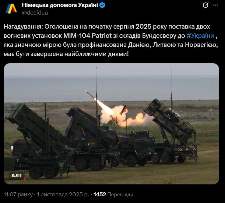 Президент Володимир Зеленський у неділю, 2 листопада, заявив, що Німеччина поставила Україні зенітно-ракетні комплекси Patriot.