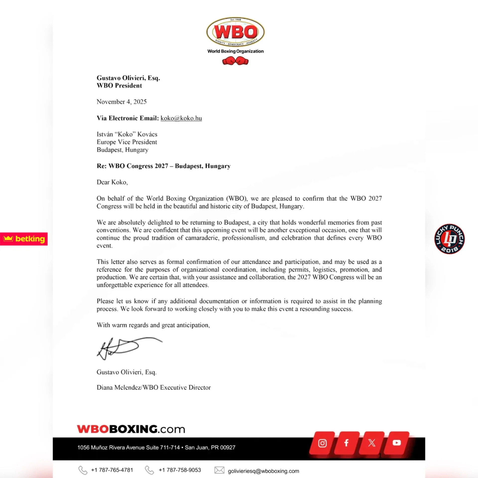 Федерація боксу Угорщини опублікувала лист від Всесвітньої боксерської організації, в якому WBO підтверджує проведення Конгресу у столиці Угорщини - Будапешті.
