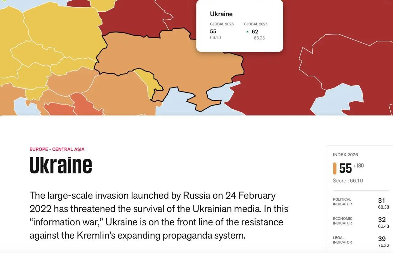 За 2026 рік Україна піднялася на 7 позицій у світовому рейтингу свободи преси, йдеться у щорічному звіті Reporters Without Borders.