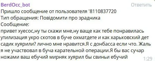 На скріні нижче 👇 риганіна кацапського бота, яку він прислав на наш бот сьогодні вночі. З цього короткого, але дуже інформативного повідомлення, редакція робить очевидний висновок (вже який за рахунком), що всі ті звірства, які під@ри демонстративно коять є ніякими там «ексцесами виконавця», а цілеспрямованою акцією по геноциду мирного населення нашої країни.