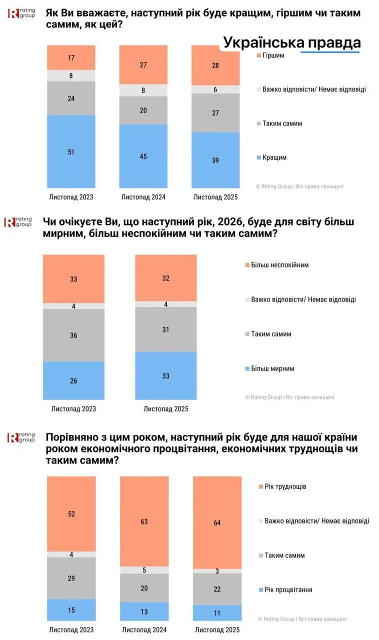• ⚡️Майже 40% українців вірять, що наступний рік буде кращим – 2 роки тому таких було ~50%, – опитування Rating Group